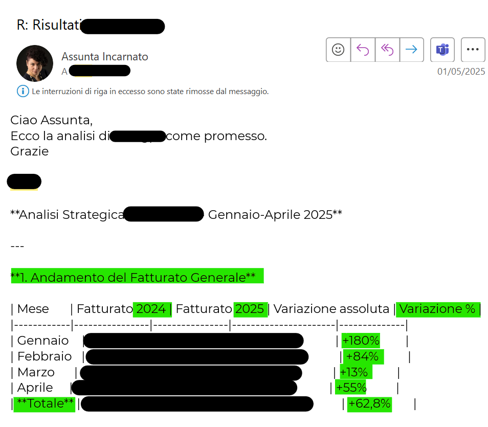 ✅ Aumento del Fatturato (+18,47%, da € 1.354.894 a € 1.605.186)