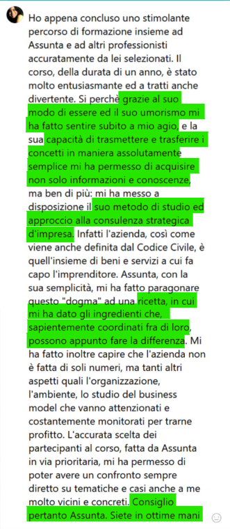 🗣️ "Mi ha fatto sentire subito a mio agio, e la sua capacità di trasmettere e trasferire i concetti in maniera assolutamente semplice mi ha permesso di acquisire non solo informazioni e conoscenze, ma ben di più: mi ha messo a disposizione il suo metodo di studio ed approccio alla consulenza strategia d'impresa."