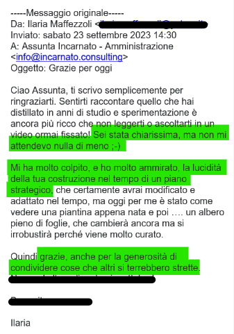 Manda per favore la ricevuta del bonifico, assieme ai tuoi dati di fatturazione, a Laura al seguente indirizzo info@incarnato.consulting.