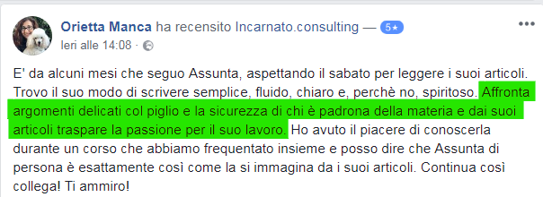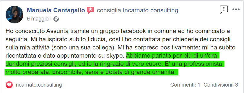 🗣️"Abbiamo parlato per più di un'ora dandomi preziosi consigli, e io la ringrazio di vero cuore. E' una professionista molto preparata, disponibile, seria e dotata di grande umanità."