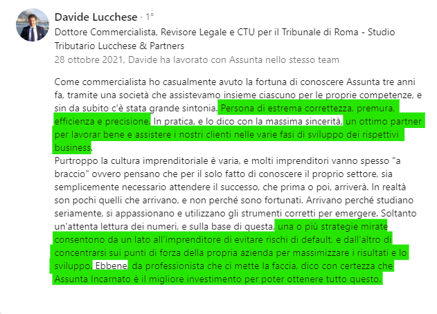 🗣️"Persona di estrema correttezza, premura, efficienza e precisione. In pratica, e lo dico con la massima sincerità, un ottimo partner per lavorar bene e assistere i nostri clienti nelle varie fasi di sviluppo dei rispettivi business."