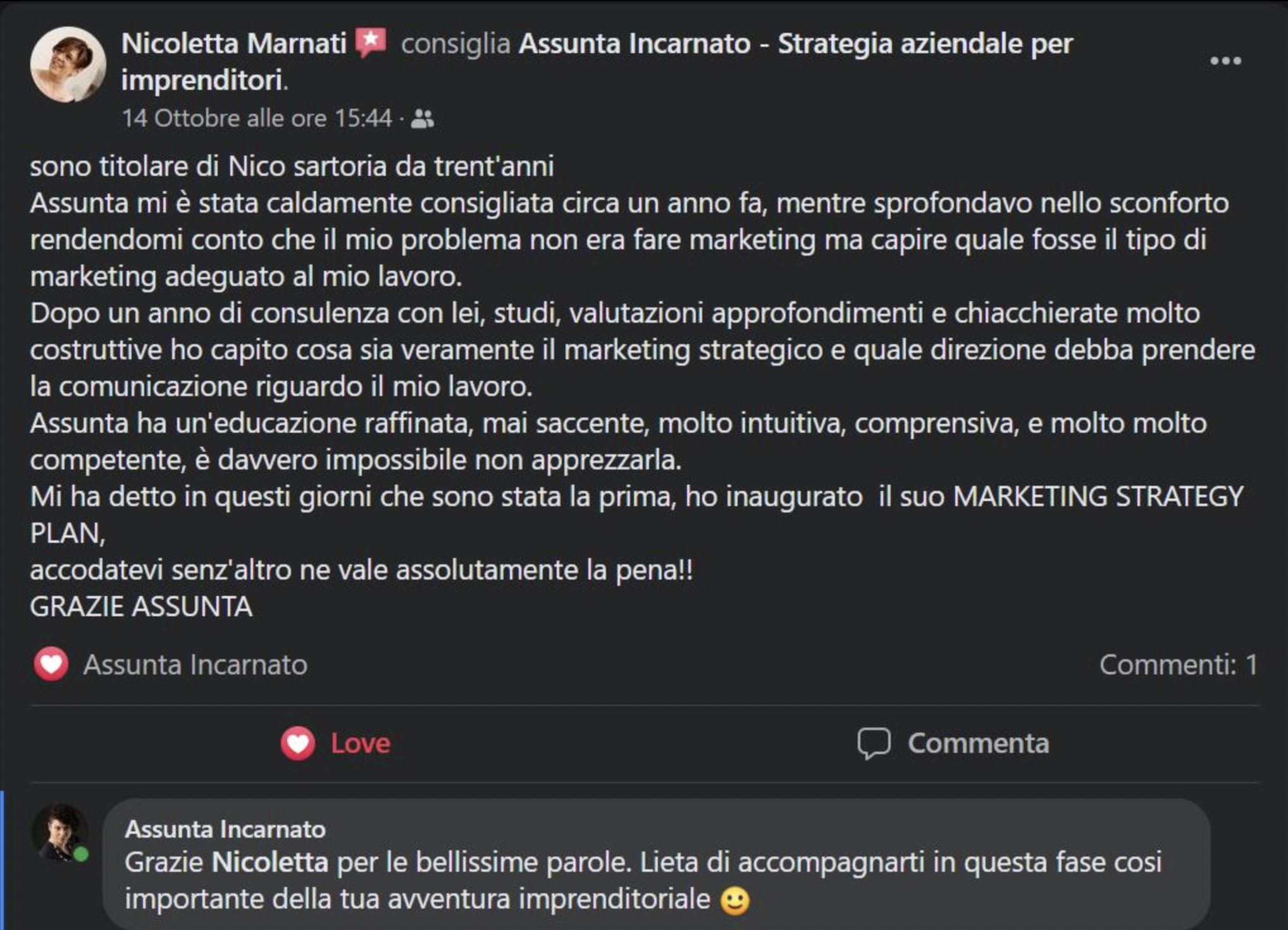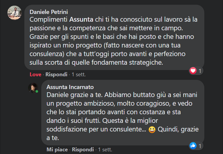 Avendo il privilegio di seguire imprenditori cazzuti, entusiasti dei risultati ottenuti, che nella maggior parte dei casi decidono di rinnovare i percorsi di consulenza.