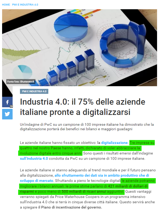 Secondo un’indagine di Pricewatercoopers, una delle più grandi società di revisione al mondo, almeno il 75% delle imprese italiane è già pronto ad affrontare la sfida della digitalizzazione.