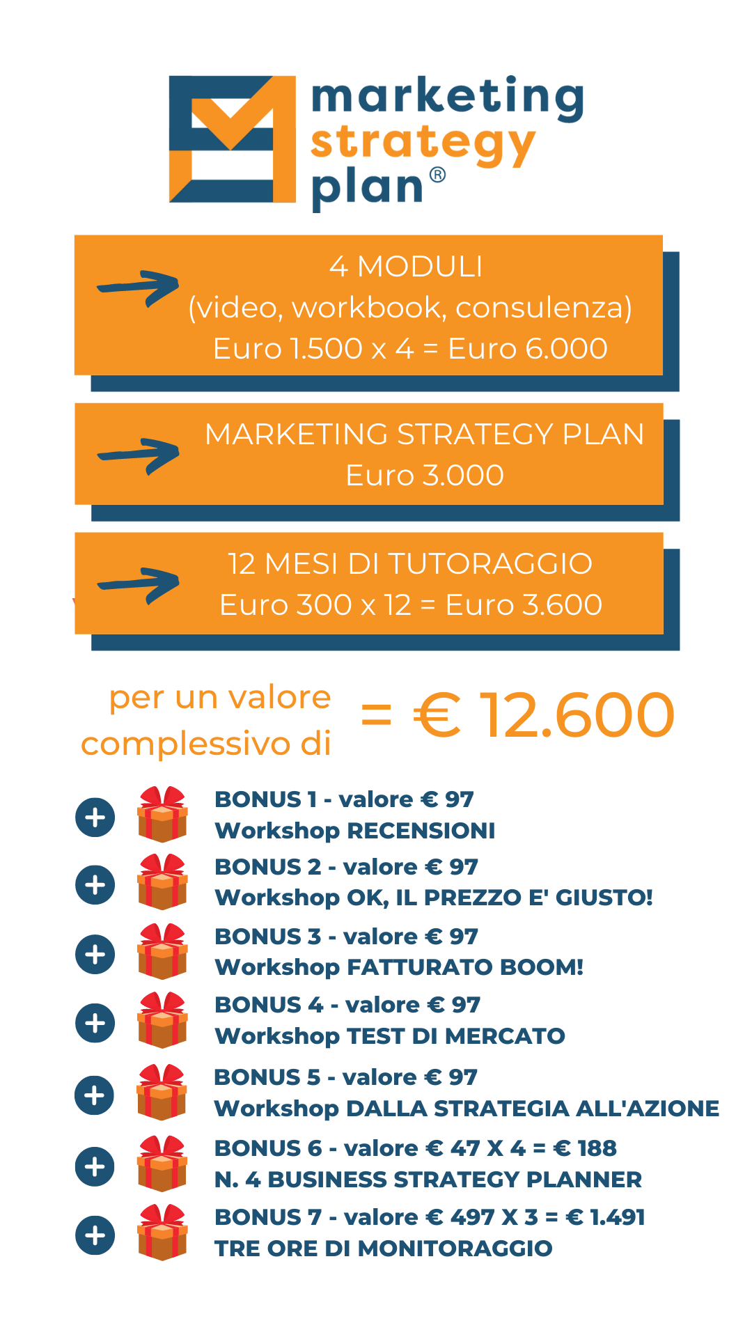 Puoi fare un vero e proprio salto di qualità, decidere di farti affiancare da me e quindi da un esperto in Strategia aziendale, e quindi accedere al percorso di consulenza Marketing Strategy Plan®…